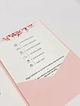 Käsitööna valminud lihtne ja elegantne kutse. Kutse suurus kokku murtult 14x19cm. Kinnituseks saab kasutada paela või kalka ümbrist koos trükiga. Kaane toone on erinevaid.