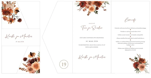 Kutse formaat 29.5x19cm, kokku murtult 10,5x19cm.
